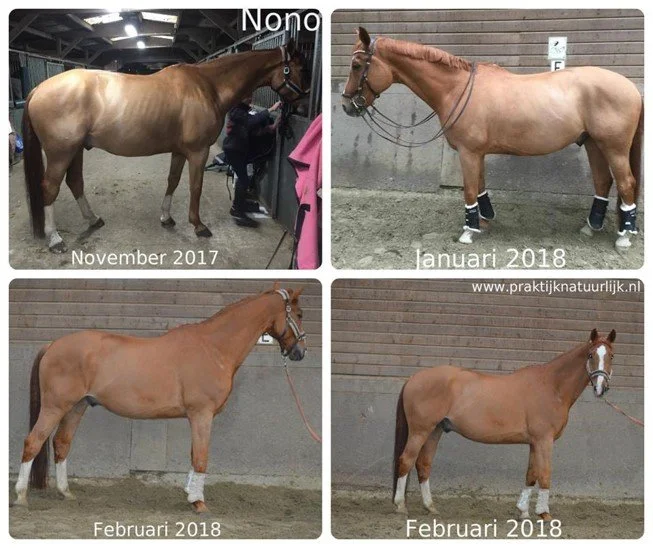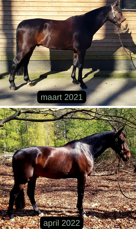 Met behulp van goed stalmanagement met goed ruwvoer in combinatie met de producten van Equilin en het (voer)advies en de behandeling van Praktijk Natuurlijk heb ik, nu 6 weken later, al een totaal ander paard. Hij is goed op gewicht (te houden), zit super strak in zijn vacht, glimt als een spiegel en heeft overal appeltjes. Hij is veel losser en soepeler in zijn lijf en heeft duidelijk weer zin om te werken. Maar het allerbelangrijkste: ik heb weer een blij paard!